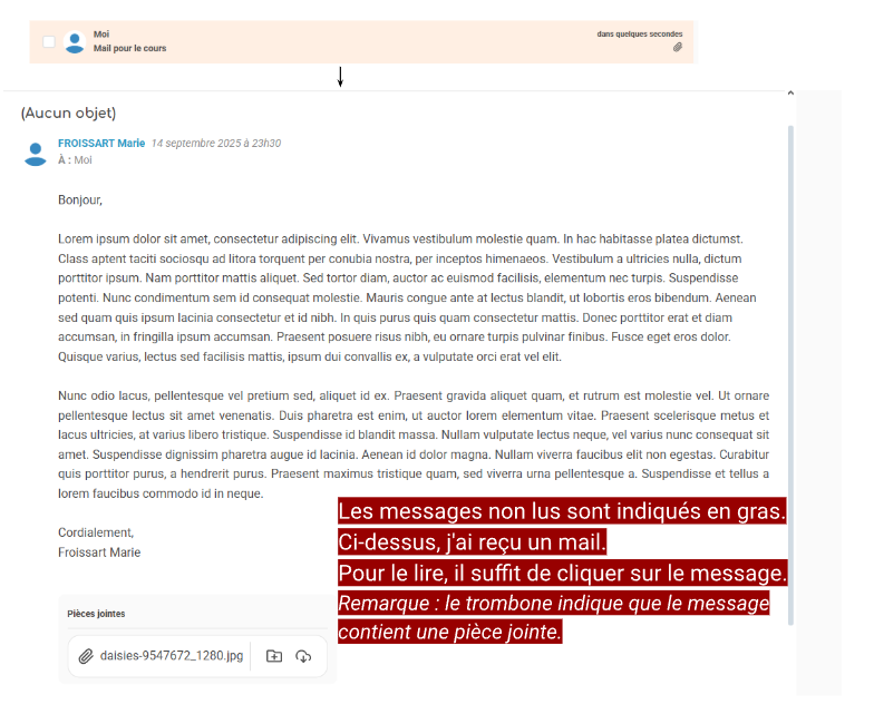 Le pied du message contient les éventuelles pièces jointes ainsi qu’un cadre pour répondre, répondre à tous les destinataires ou transférer le message à un autre correspondant.