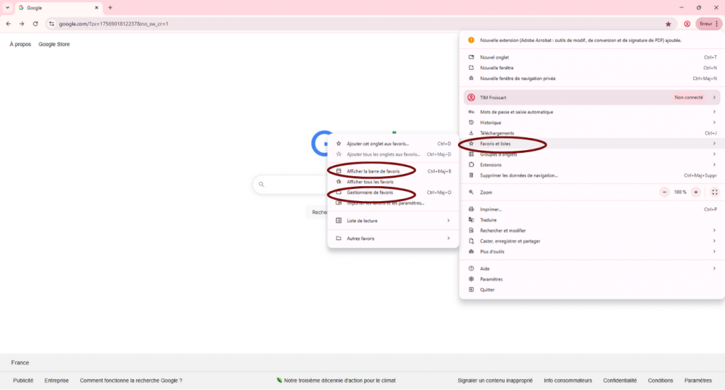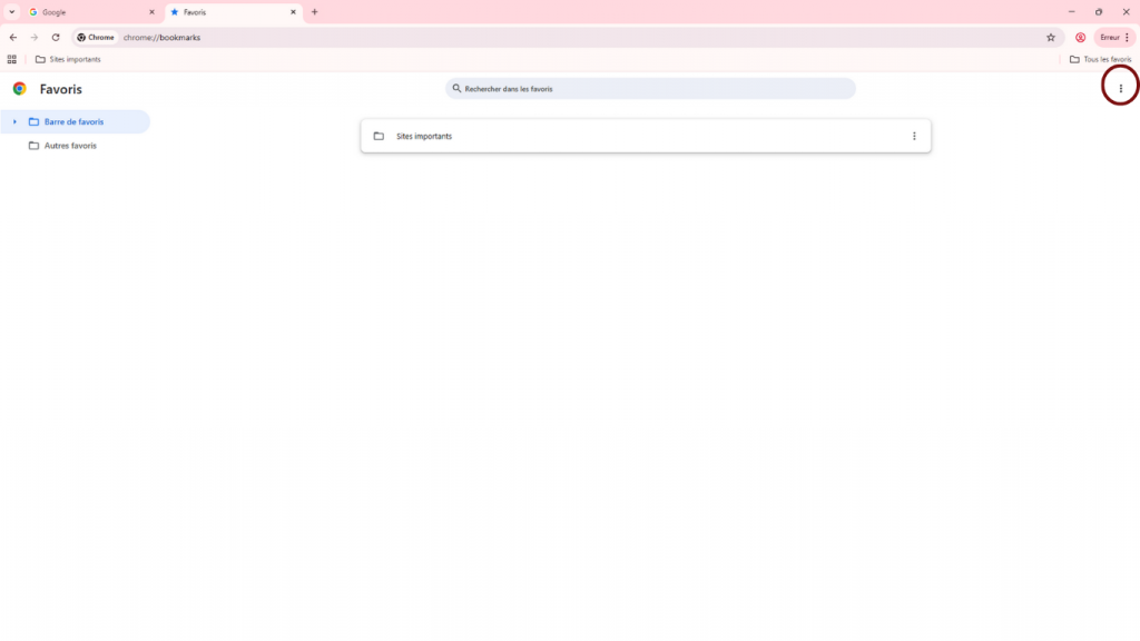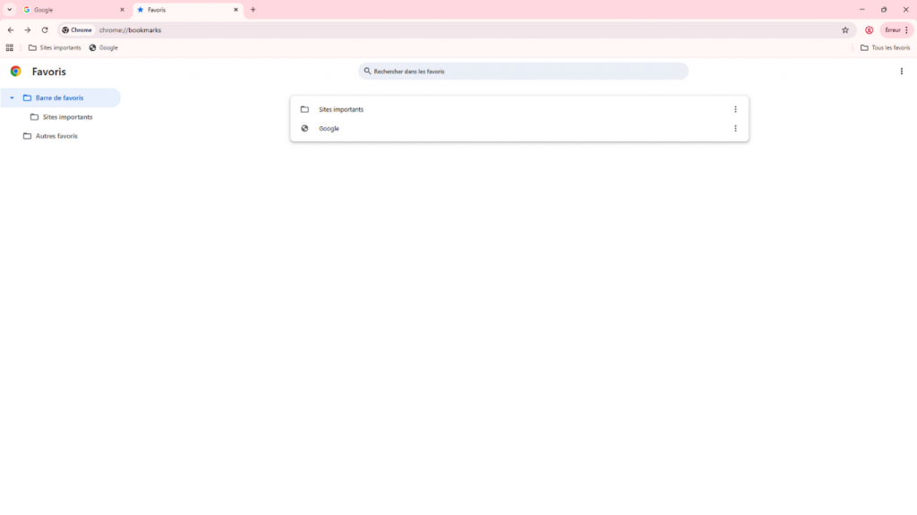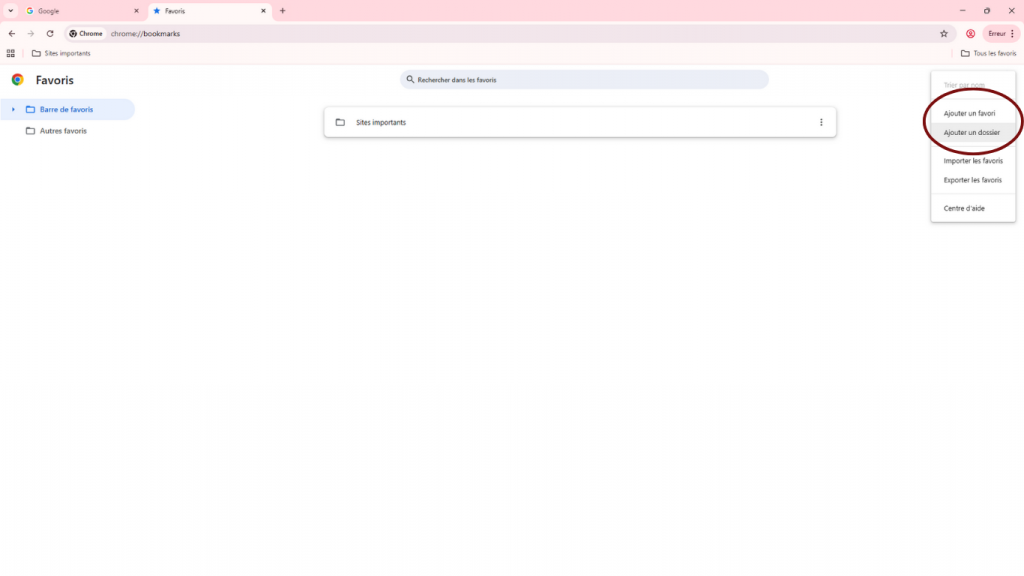 Note : « Sites importants » est un dossier, « Google » est un favori