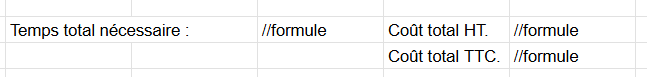 • Écrivez la formule complète que vous insérerez dans la dernière cellule de la colonne temps total nécessaire. Faites pareil pour le coût total HT.
